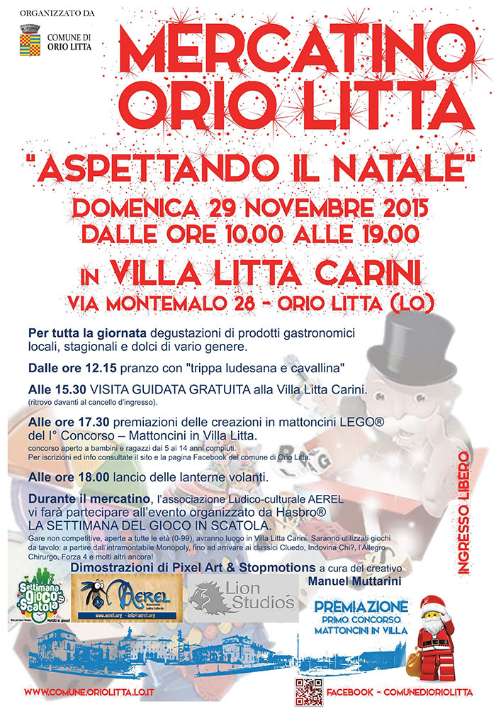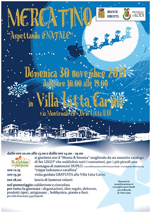 Appuntamento per Domenica 29 Novembre nel suggestivo scenario di Villa Litta Carini per una nuova edizione del "Mercatino Aspettando il Natale", tradizionale evento natalizio organizzato dal Comune di Orio Litta con il patrocinio della Provincia di Lodi.