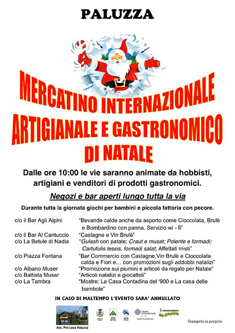 La proloco di Paluzza organizza anche quest'anno per Sabato 12 e Domenica 13 Dicembre tra le vie del centro del paese il tradizionale Mercatino di Natale "Natale nella Val But".